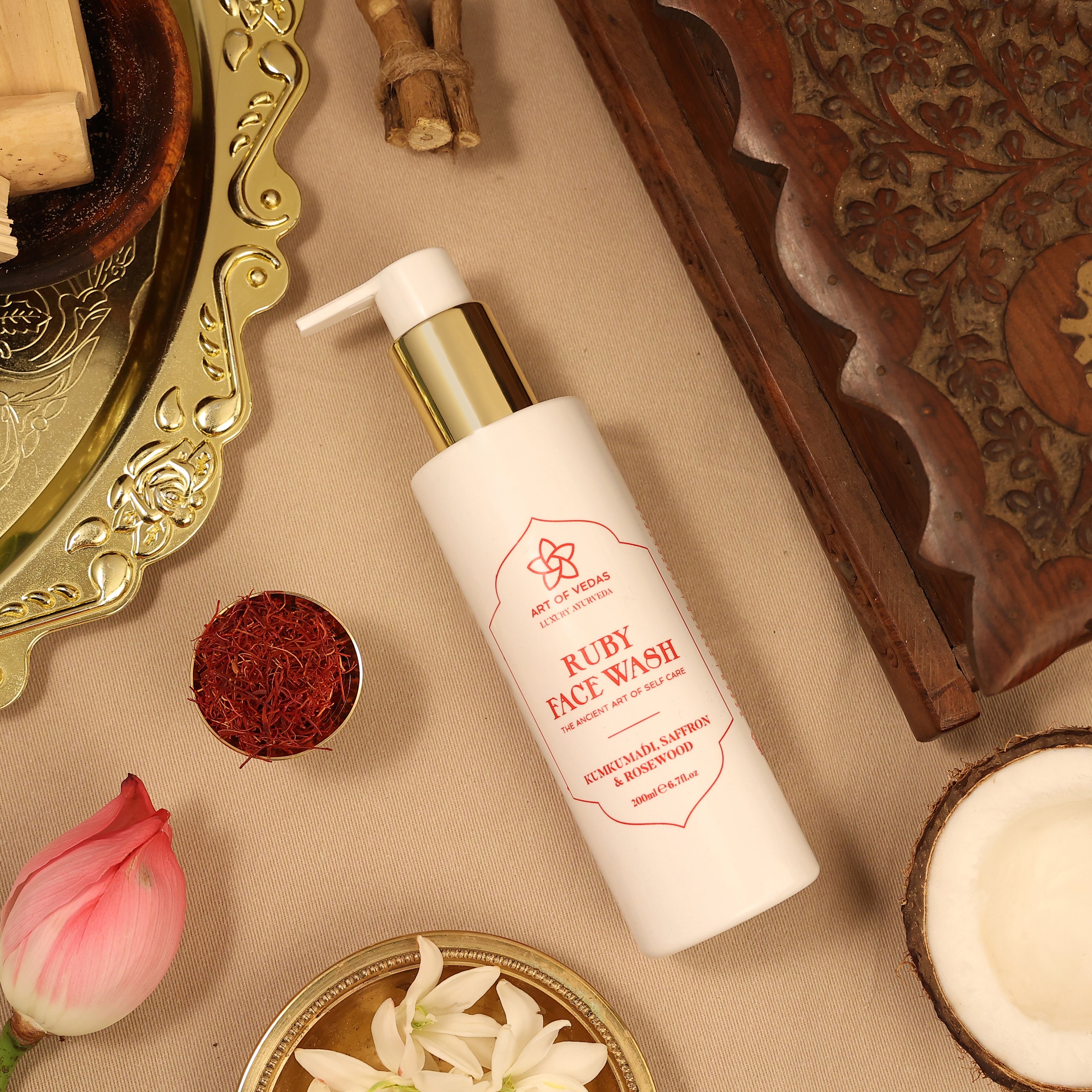 - Ruby Face Wash (150ml): A gentle cleanser infused with Kumkumadi and saffron to purify the skin while retaining its natural moisture and glow.