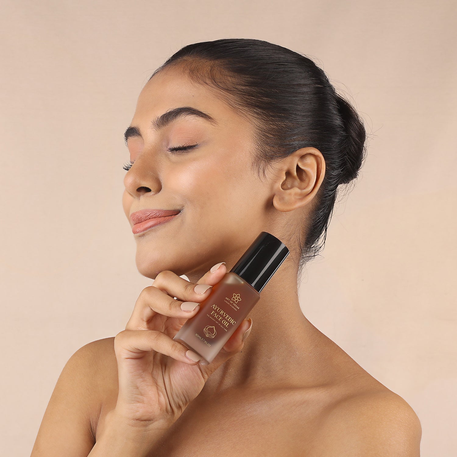 The Ayurvedic Face Oil, enriched with botanical extracts and herbs, penetrates deeply to nourish and support your skin's natural rejuvenation process. It helps balance doshas (energetic forces in Ayurveda) to bring out your skin’s healthiest state, reducing the appearance of uneven tone, dryness, and fine lines.