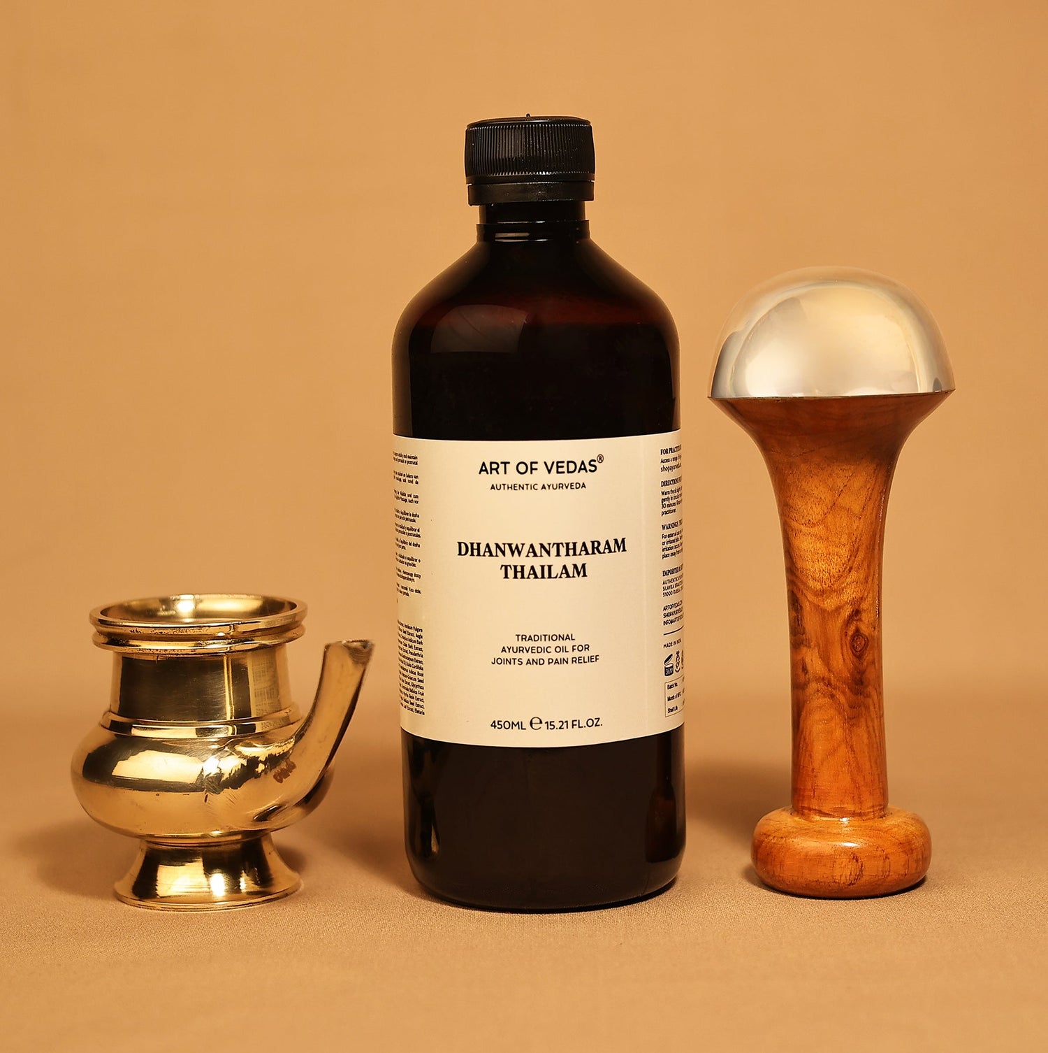 For deeper classical support, Dhanwantharam Thailam brings over 28 herbs in a single oil, traditionally the most valued companion for full-body Abhyanga. Any of these oils provides the right texture and nourishment for the wand to work effectively on the skin.